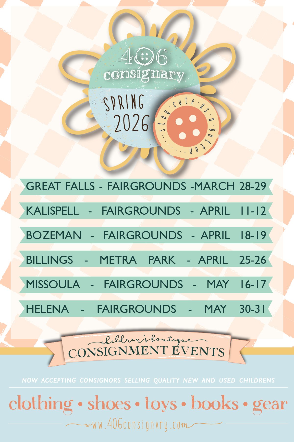 At 406 Consignary, we carefully inspect every item that enters our doors, so you'll only have the best to choose from! Every spring and fall, we have thousands of new {and gently-used} name-brand and boutique items at 30-90% off retail! Hosting in six Montana cities for three days only, save the date so you won't miss it!