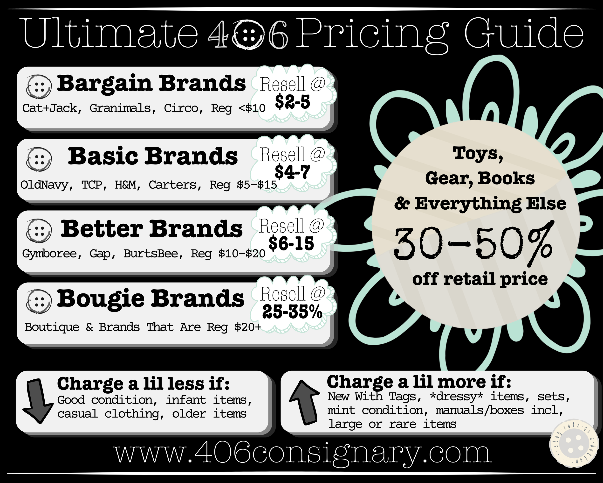 Most items Sell for 30-50% of what the item can be purchased for new. So if $20 kids jeans went on sale for $10… charge 30-50% of $10 (aka $3-$5)